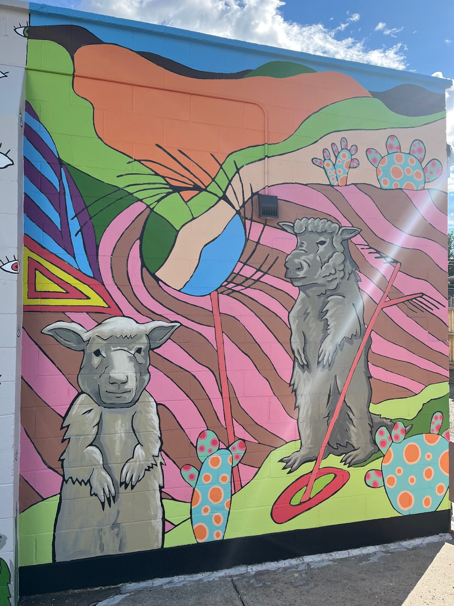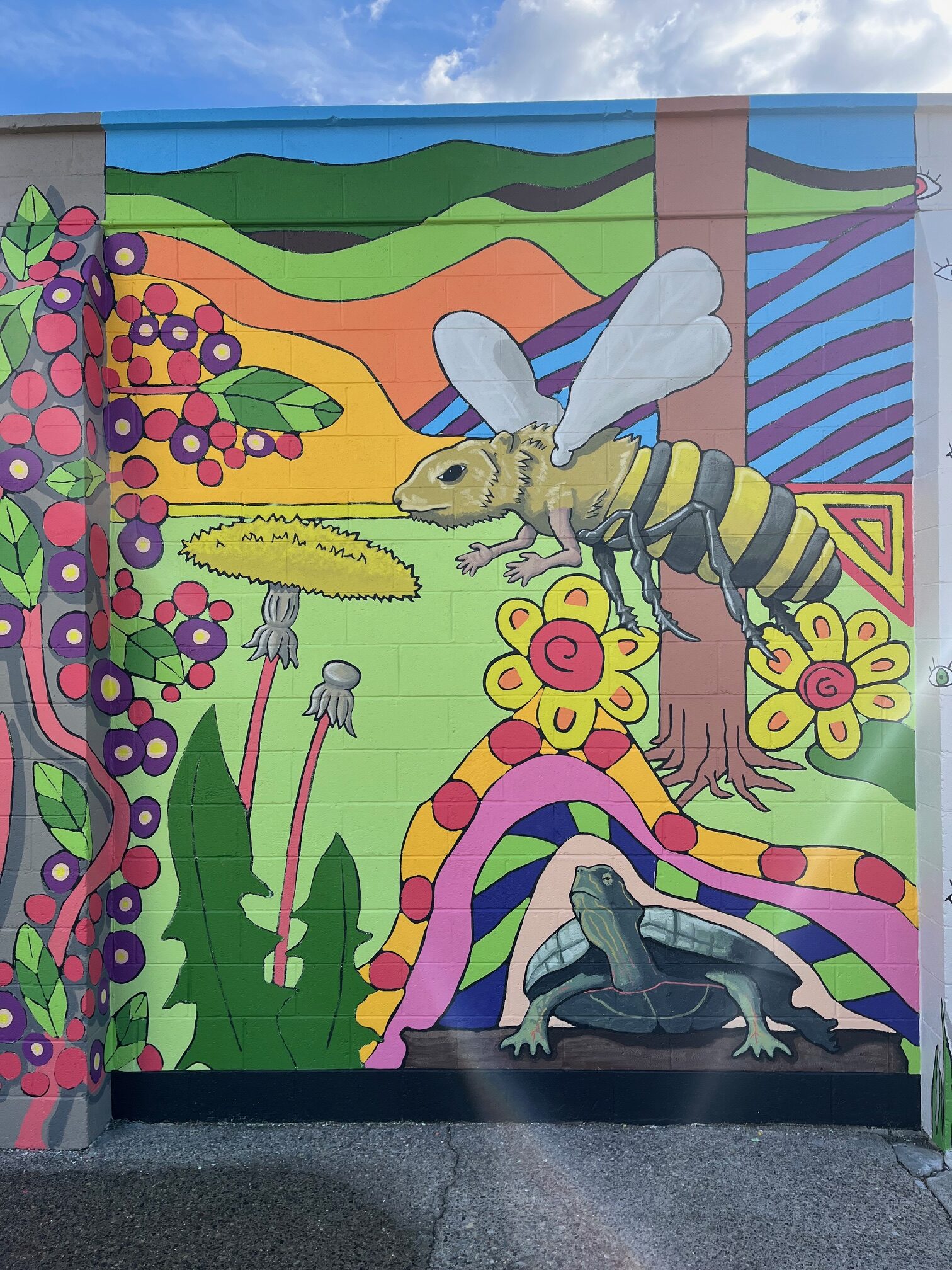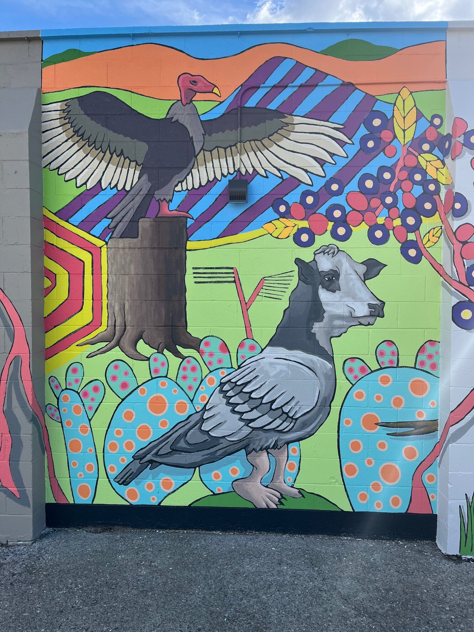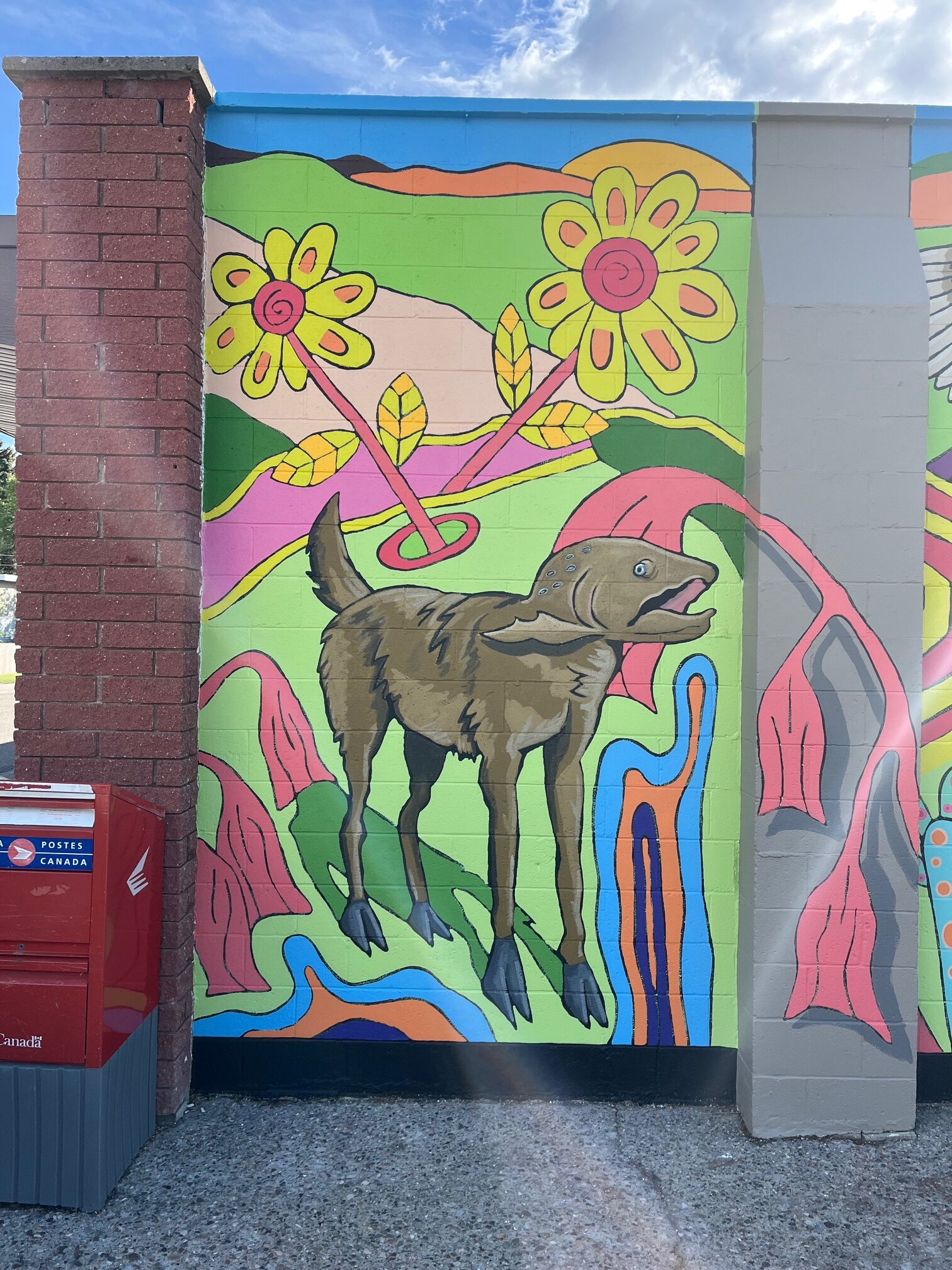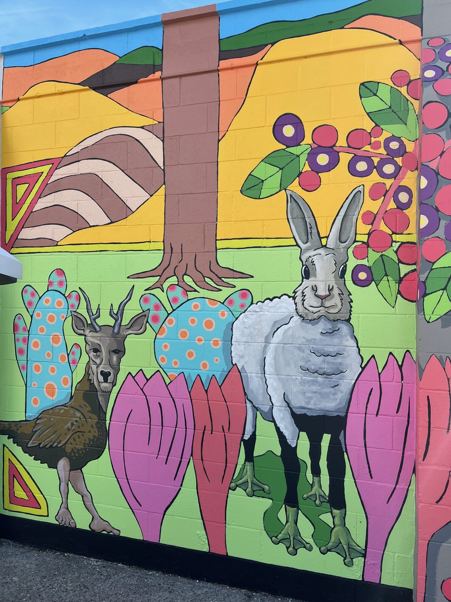 The artists explored the diversity of Lethbridge symbolically, by painting an image that imagines the city as both a garden and zoological menagerie. A garden teeming with both indigenous flora & fauna, as well as introduced species. A vibrant and colourful mural populated by hybrid animals and plants. What are the plants and animals in the mural?